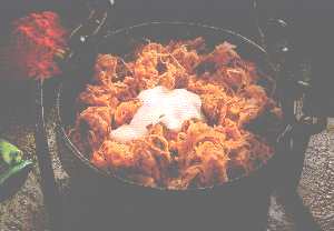 Pfeffer, edelsüßer Paprika, 1 TL Kümmel, 1 EL Tomatenmark, 1 kleiner Becher saure Sahne Zubereitung: Das Fleisch in gulaschgroße Würfel schneiden, Schmalz in einem Topf erhitzen und das Fleisch darin unter