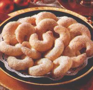 Zutaten: 300 g Mehl + 250 g Butter + 125 g Zucker + 3 Eigelb + 125 g abgezogene geriebene Mandeln + 250 g Puderzucker + 2 Päckchen Vanillezucker