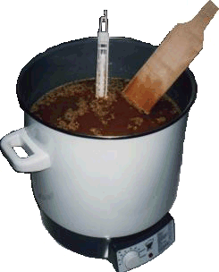 bei der sich nun der Sud gelbbraun färben sollte. Rühre dann den Sud mit der Maische weiter und erhitze ihn auf 78 °C; keinesfalls darüber, denn sonst würde der Sud für die