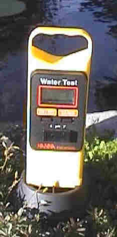 Wassertest-Geräten die entweder gold- oder platinbeschichtete Elektroden haben, gemessen werden. Solche Geräte -wie etwa den links abgebildeten Tester-, der
